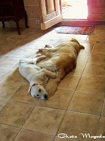 Beza jest psem na niewidzialnej gumce, która rozciąga się maksymalnie do kilku metrów. Nie odstępuje mnie ani na minutę, chodzi za mną wszędzie a z powodu mojego uziemienia w kuchni - w owej kuchni spędza całe dnie. Jest cudowna!!! Kochająca do bólu, posłuszna i urocza. Rośnie w niepokojącym tempie i przez to przeokropnie chuda. Składa się prawie wyłącznie z dłuuuugich łap i oczu. Stał się cud! Nasz Bury, który nie polubił żadnego z naszych zwierząt - Bezę uwielbia! Oczywiście z wzajemnością. Ze wzruszeniem przyglądam się jak okazują sobie sympatię, wymieniają czułości. Nie udało mi się uchwycić aparatem takich chwil zbyt wiele ale - proszę tu maleńka próbka: